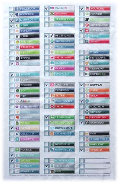 Als Gegenstück zum T-Shirt „you read my t-shirt. that’s enough social interaction for one day“ gibt es auch ein T-Shirt mit 79 Social Media Diensten, damit man gleich selber ankreuzen kann auf welchen man aktiv ist. Darunter sind Facebook, Flickr, MySpace , Reddit, Digg, Skype, YouTube, Technorati und noch viele weitere.